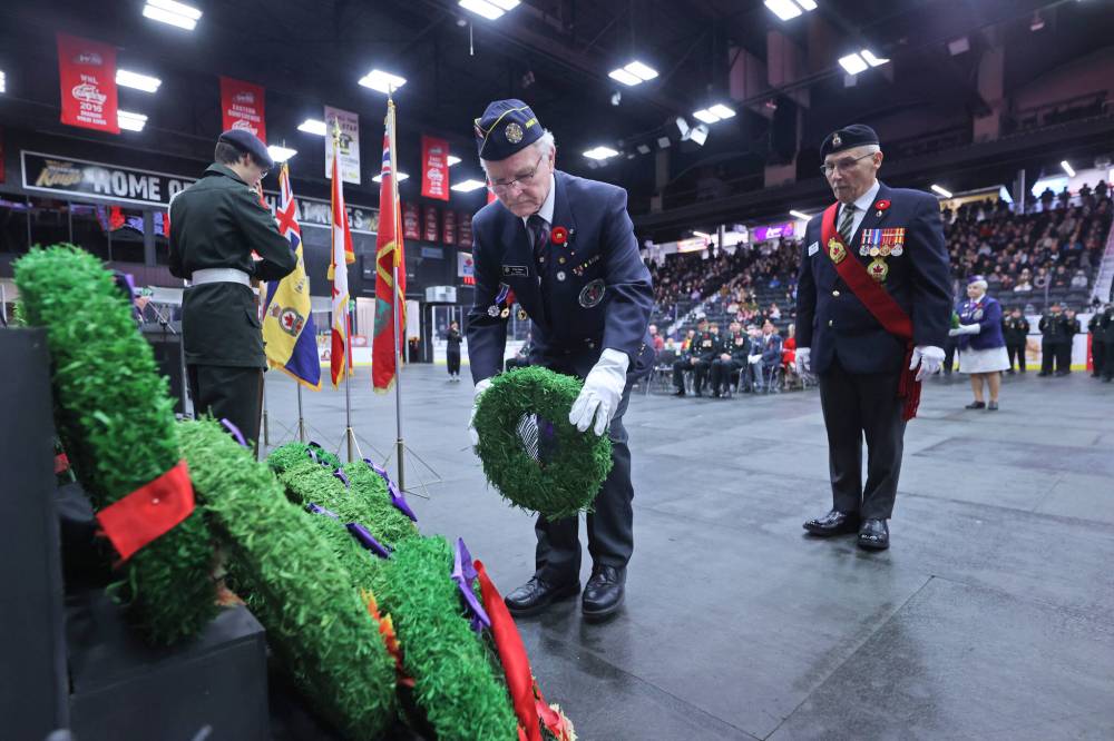 Peter Reiss, president of the ANAF Unit #10 Brandon, lays a wreath during the Remembrance Day ceremony at Westoba Place in the Keystone Centre on Monday morning. (Matt Goerzen/The Brandon Sun)