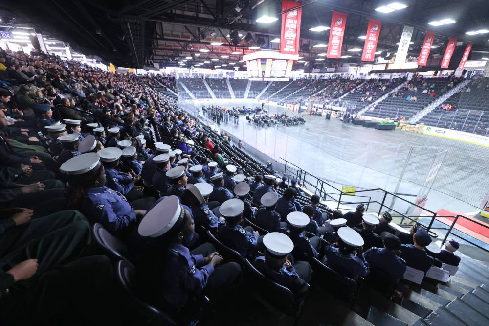 Navy League Cadets watch the rest of the Remembrance Day ceremony from the stands on Monday morning after they marched into Westobe Place arena before "The Last Post." (Matt Goerzen/The Brandon Sun)