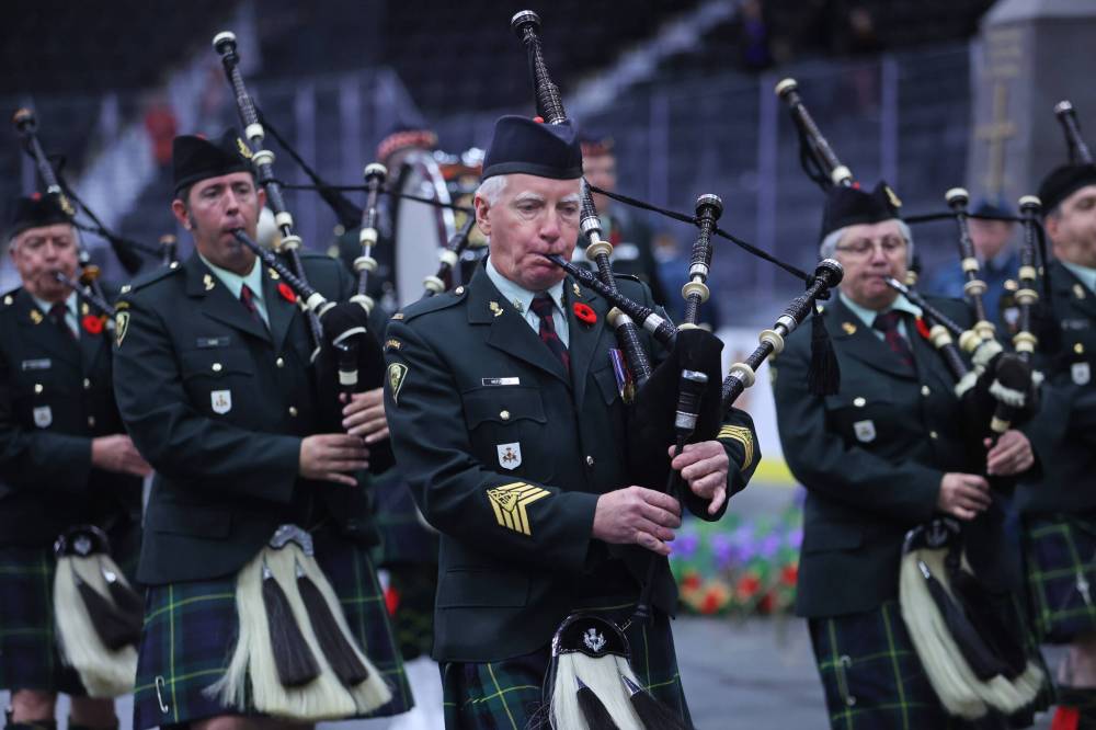 Pipe Major James McFadden plays his bagpipes during the march out of the arena. (Matt Goerzen/The Brandon Sun)