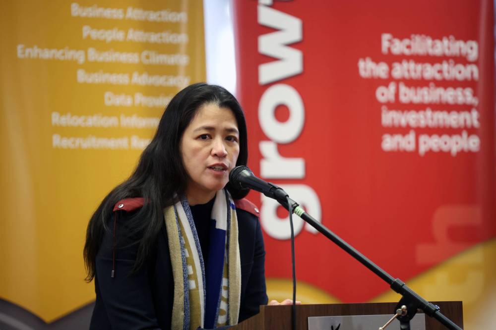 Provincial Labour and Immigration Minister Malaya Marcelino speaks during Thursday’s announcement. (Photos by Tim Smith/The Brandon Sun)
