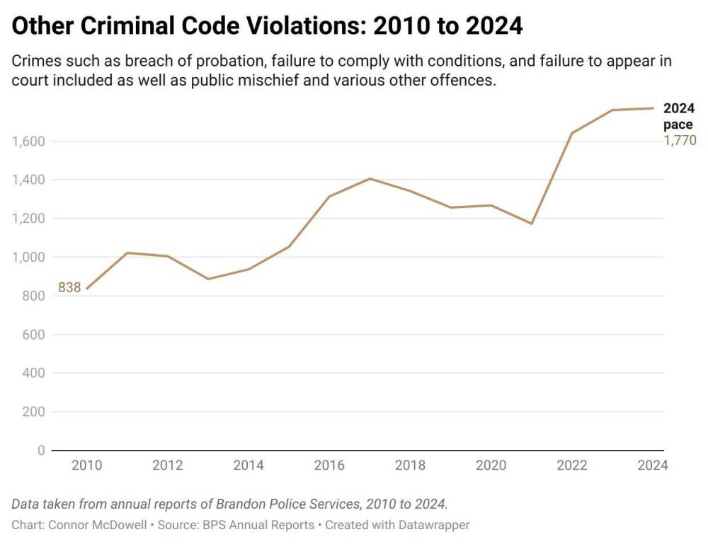 Brandon has seen a gradual increase in violations pertaining to court orders and release conditions for a third consecutive year, as per data released last month. The number of such cases has risen by over 33 per cent since 2021 to 1,770 year-to-date. It has more than doubled since 2010. Listed under the “other Criminal Code offences,” category, parole violations include breach of probation, failure to comply with bail conditions, and failure to appear in court.