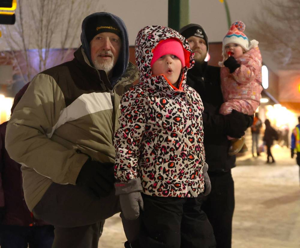 Arabella Quesnel looks on in wonder, as Santa’s sleigh comes closer to where she and her family were standing during the Brandon Santa Parade Saturday evening. Abigail Quesnel pauses with her lolipop, to have a look too. (Photos by Michele McDougall/The Brandon Sun)
