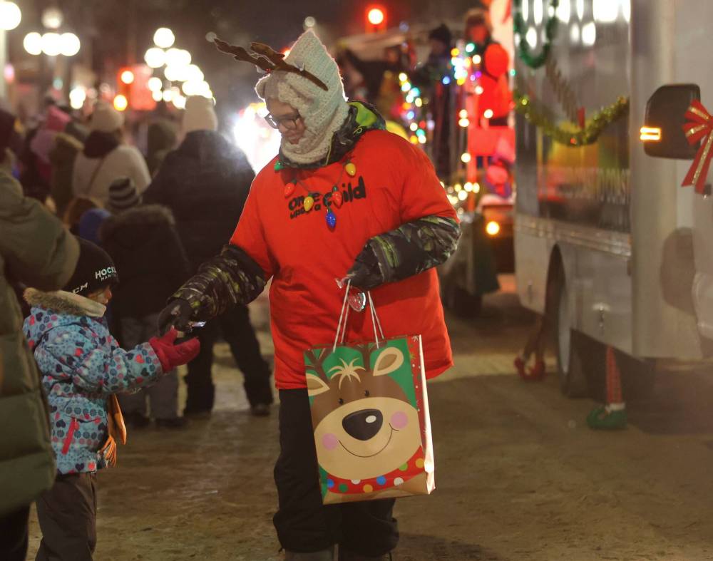 A volunteer with the Brandon Santa Parade hands out candy to a child along the parade route on Rosser Avenue.