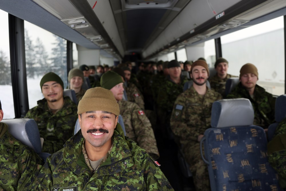 Cpl. Aaron MacLennan sits at the front of the bus leaving CFB Shilo on Friday. About 175 soldiers deployed from the base near Brandon, travelling to Winnipeg by bus, from where they will fly to Latvia as part of Operation Reassurance. The operation trains NATO allies and deters aggression in the area through military presence. Soldiers from Shilo will be serving a six-month deployment as part of the operation. (Connor McDowell/The Brandon Sun)