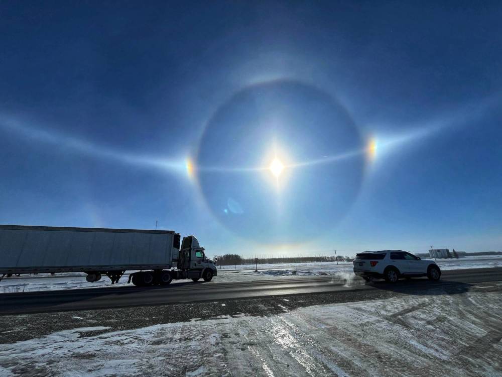 A “sun dog” appears above the Trans-Canada Highway east of Portage la Prairie on Sunday afternoon. The photographic effect is made when the sun’s light shines through ice crystals. According to Environment and Climate Change Canada, it’s no illusion that this February has been especially cold. (Matt Goerzen/The Brandon Sun)