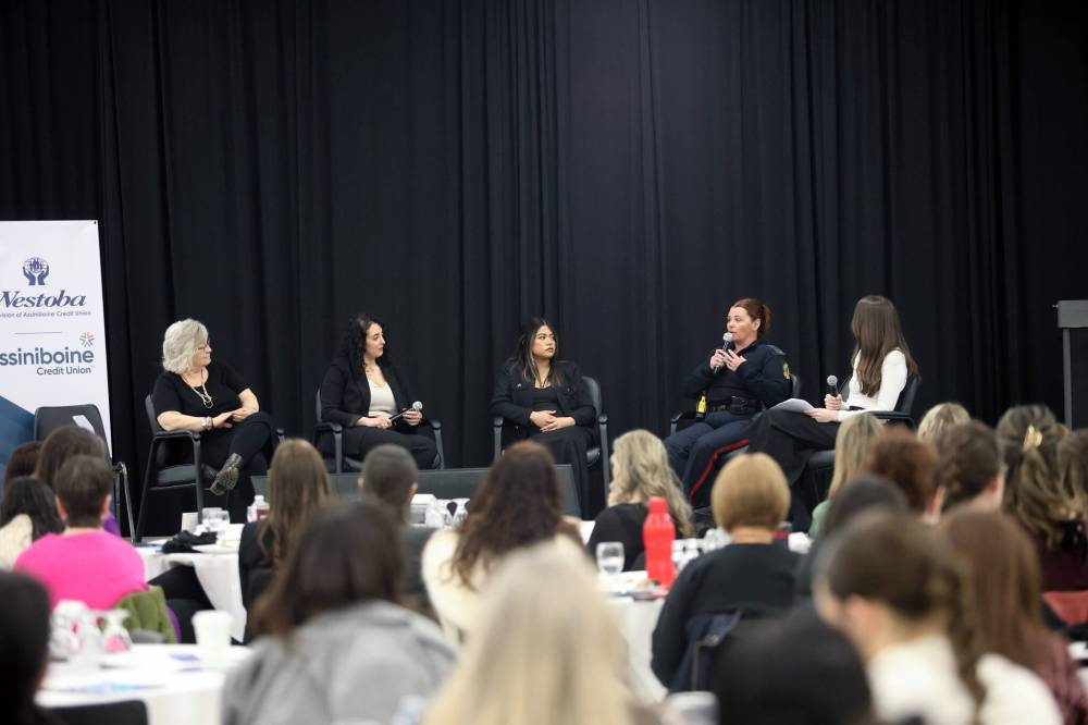Const. Amanda Conway of the Brandon Police Service (second from right) describes her values during a panel at the Women of Westman conference at the Keystone Centre on Wednesday. When Conway was asked what message she wanted to leave with every woman at the conference, Conway said “living true to your values,” which in her case are family, authenticity and honesty. Panelists discussed a range of topics about responsibility, mental health and leadership. Other panelists, from left to right, included Sue Swarbrick, Rand Tashman and Eleonor Mascardo.