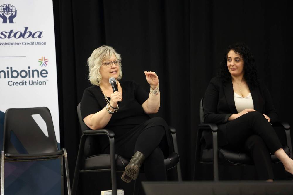 Sue Swarbrick (left) describes the need to be good to your body during a panel at the Women of Westman conference on Wednesday. Swarbrick said her No. 1 takeaway was for women to be good to their bodies in ways like watching the fuel they put in. Meanwhile, Rand Tashman (right) said the No. 1 takeaway she recommends is that women be more supportive of one another. Tashman suggested doing something positive every day for someone else.