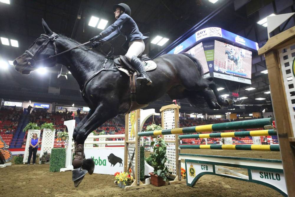 Abbey McLeod, riding Dicontendro, jumps the CFB Shilo hurdle during the Manitoba Agriculture & Provincial Ex of Manitoba Cup jumping event during last year’s Royal Manitoba Winter Fair. This year’s event runs from March 31 through April 5. (Matt Goerzen/The Brandon Sun files)