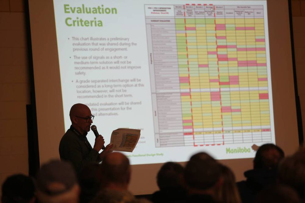 Donovan Toews, a planner with Landmark Planning who led a presentation for a crowd of more than 60 people, said three options for the intersection are still under review. However, Toews’ presentation at Carberry Collegiate focused on the RCUT design, or reduced conflict U-turn, because he said it is unfamiliar to Manitobans.