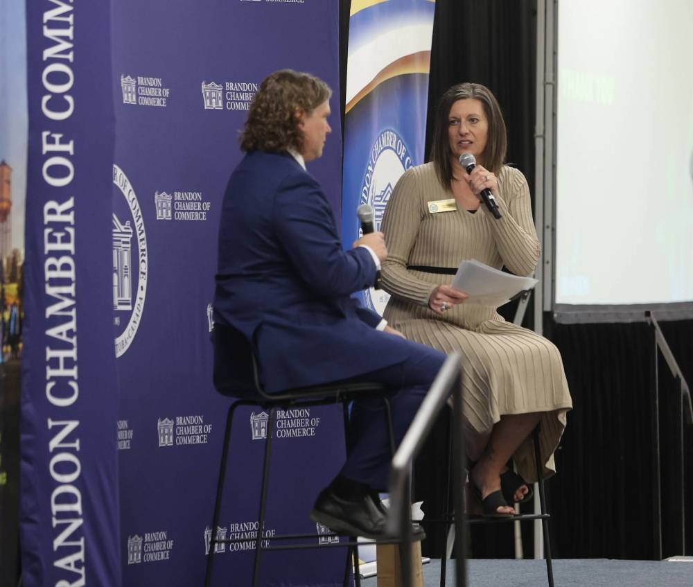 Brandon Chamber of Commerce president Lois Ruston asks Fawcett followup questions after his address to the business community Thursday.