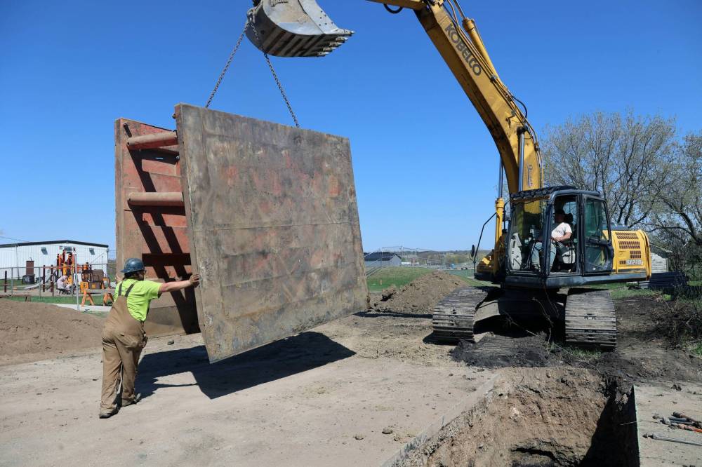 Quarry Hills Construction staff heave a structure out of a 10-foot hole in Stickney Avenue in Brandon on Thursday. The structure is placed in the hole to provide support while crew jumps in to search for the sewer main with shovels. They are connecting pipes to a property that is planned for development by Habitat for Humanity next to the North End Community Centre. The hole is set to be filled back up on Monday. (Connor McDowell/The Brandon Sun)