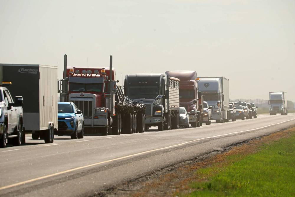 Traffic is backed up in the westbound lanes of the Trans-Canada Highway west of Carberry on Tuesday morning. The lanes were reopened around 2 p.m. (Tim Smith/The Brandon Sun)