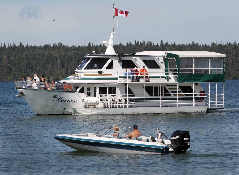 In this file photo, the Martese cruise boat sails into the pier at Clear Lake beach past a motorboat at the main beach in Wasagaming during an August long weekend. Parks Canada announced Friday that all motorized craft would be banned from the lake this season, after saying in January that they would be allowed. (Brandon Sun files)