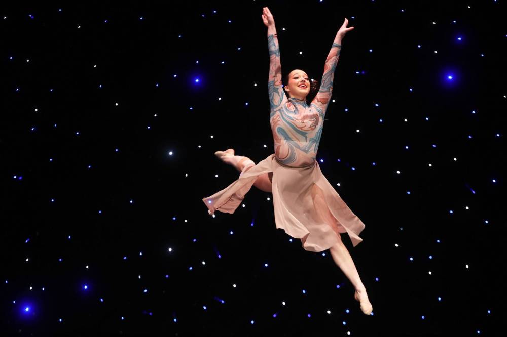 Mila Yuel leaps through the air while performing in the competitive senior lyrical (15) solo category.