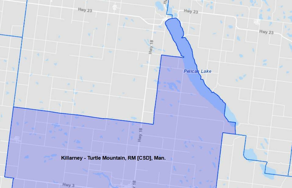 A map of Killarney-Turtle Mountain shows its plot of land along the southwest side of Pelican Lake. The municipality has two boat launches along the lake, which are open to the public. (Statistics Canada)