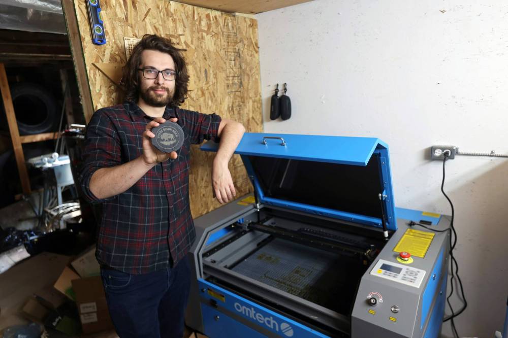 Liam Kelley leans on his laser engraver, holding a coaster that he customized. For three weeks, he has been unable to receive supplies through Amazon. The company says deliveries to some areas have been halted amid the Canada Post labour dispute. (Connor McDowell/The Brandon Sun)