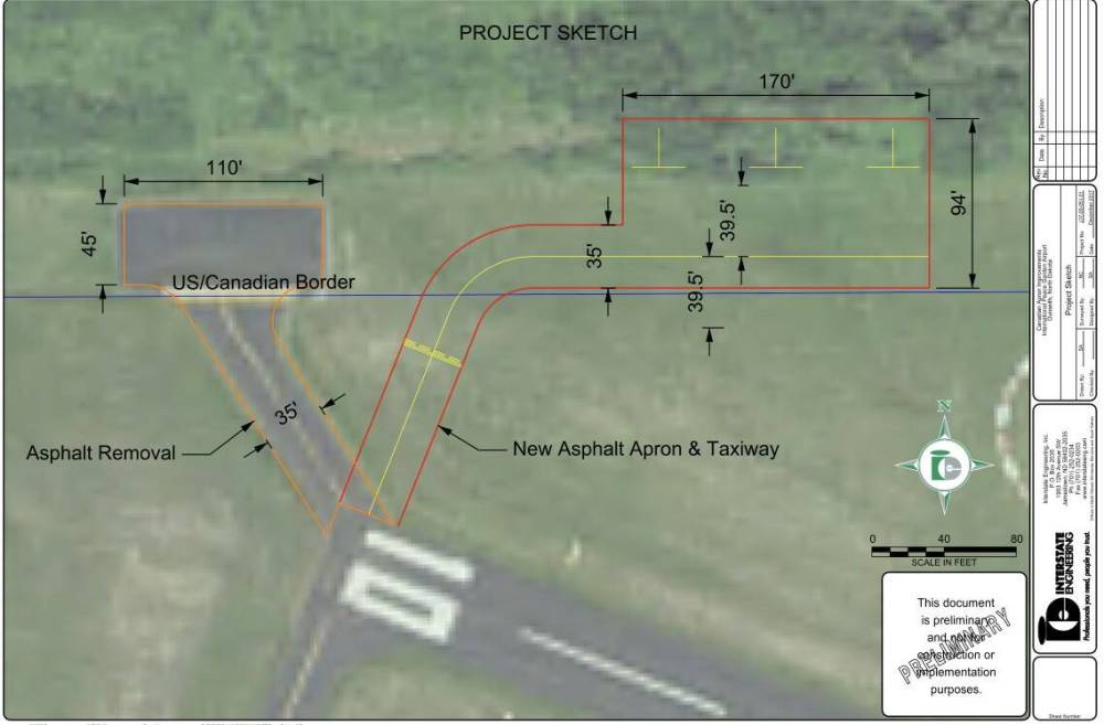 Looking for ways to keep the airport connection going, North Dakota had engineers sketch a new design that would pay American dollars for a new taxiway. All that would be needed is Canadian authorities to commit to move the Canadian tarmac roughly 300 feet to the east, and connect to the taxiway at the new location.