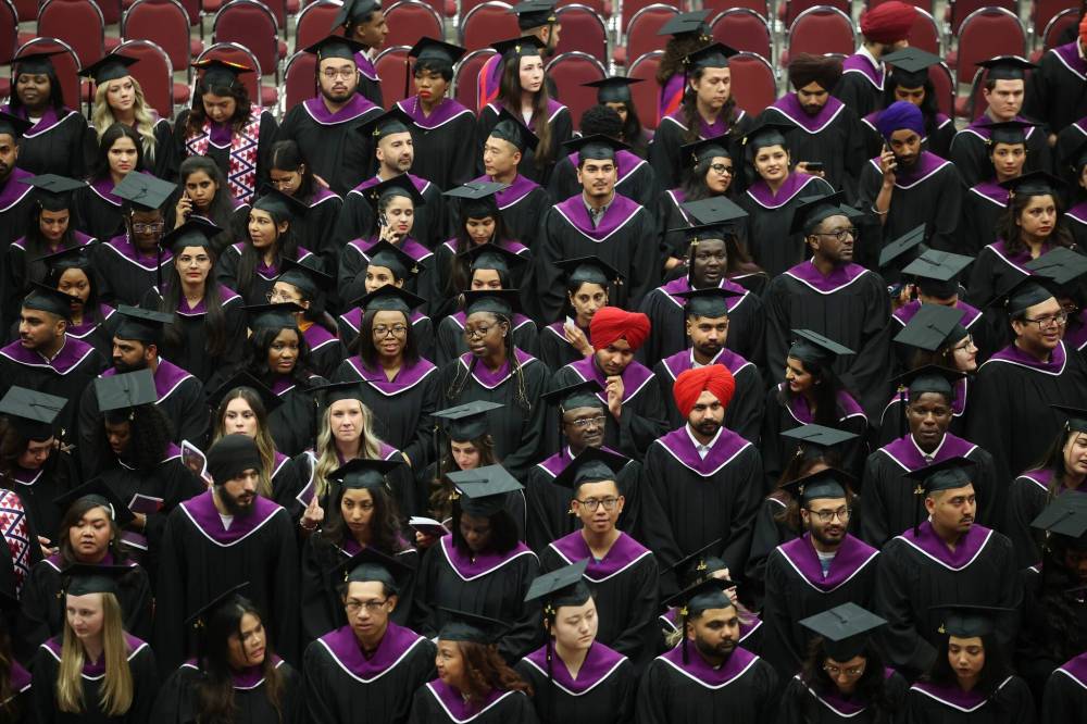 Graduates in caps and gowns wait for the commencement of the Assiniboine College graduation ceremony for the Peters School of Business and Russ Edwards School of Agriculture and Environment at Westoba Place on Friday morning. (Photos by Tim Smith/The Brandon Sun)