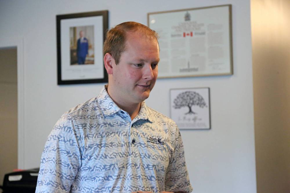 Brandon-Souris MP Grant Jackson speaks to staff at his constituency office in Brandon on Friday. The 28-year-old has been an MP for about a month and a half. (Alex Lambert/The Brandon Sun)