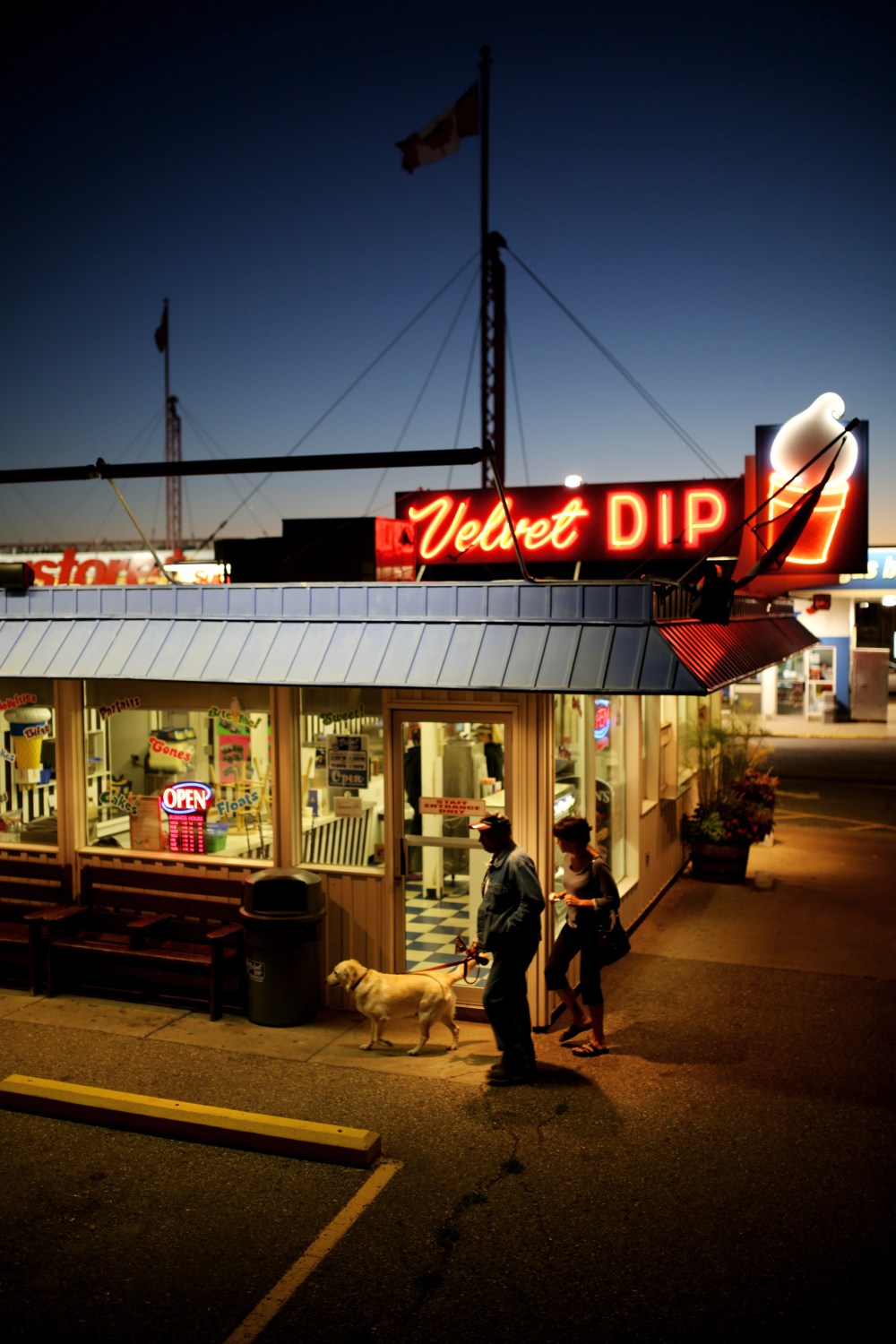 The neon lights of the Velvet Dip ice cream shop on Victoria Avenue glow as customers take advantage of the nice evening to get an ice cream fix in this file image. (Tim Smith/Brandon Sun Files)