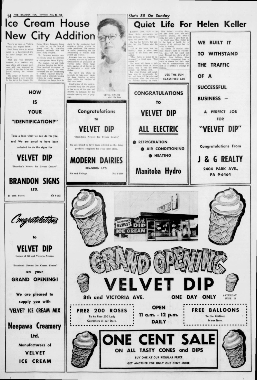 A page from the June 26, 1965 edition of The Brandon Sun showing a grand opening advertisement from the Velvet Dip. (Brandon Sun files)