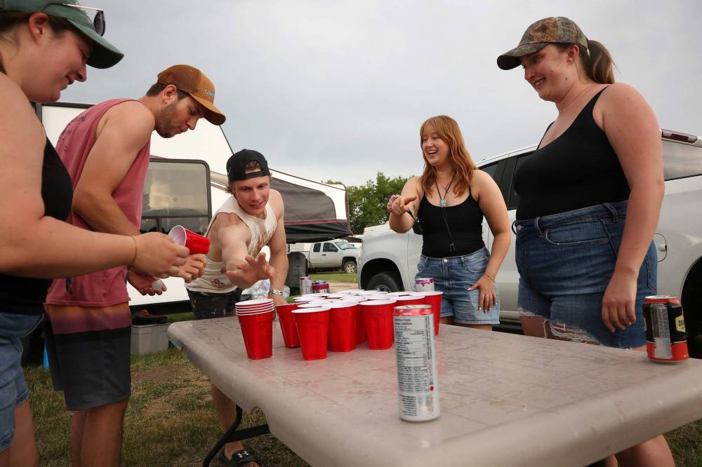 A group of friends from Winnipeg play a game of stack cup at their campsite at Countryfest. (Tim Smith/The Brandon Sun)
