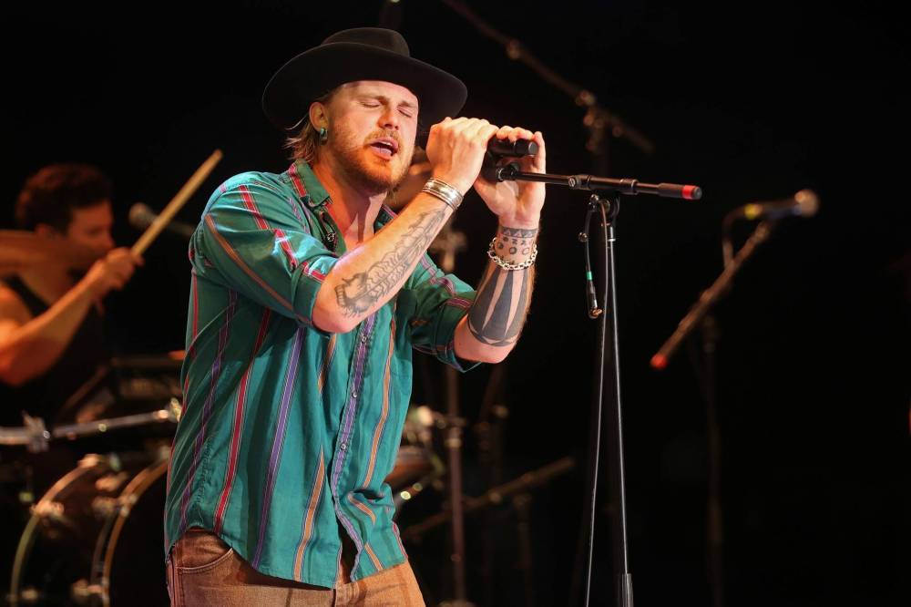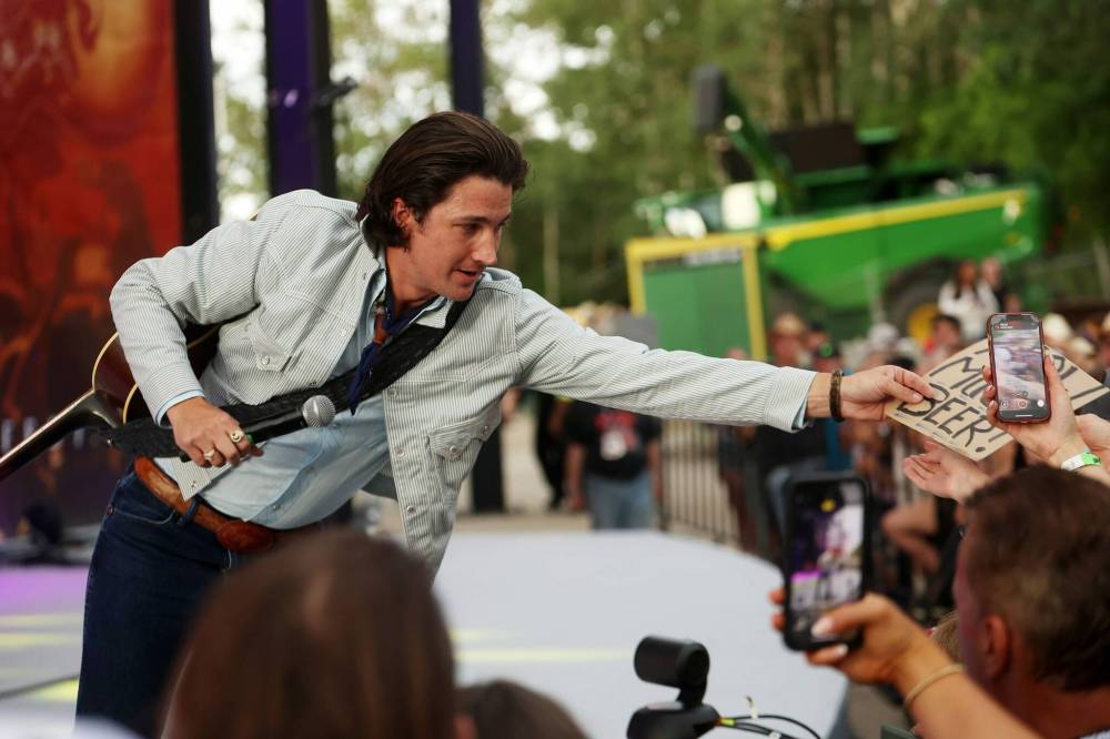 Drake Milligan of Texas grabs a sign from a fan while performing with his band on the main stage Countryfest Friday evening. (Tim Smith/The Brandon Sun)