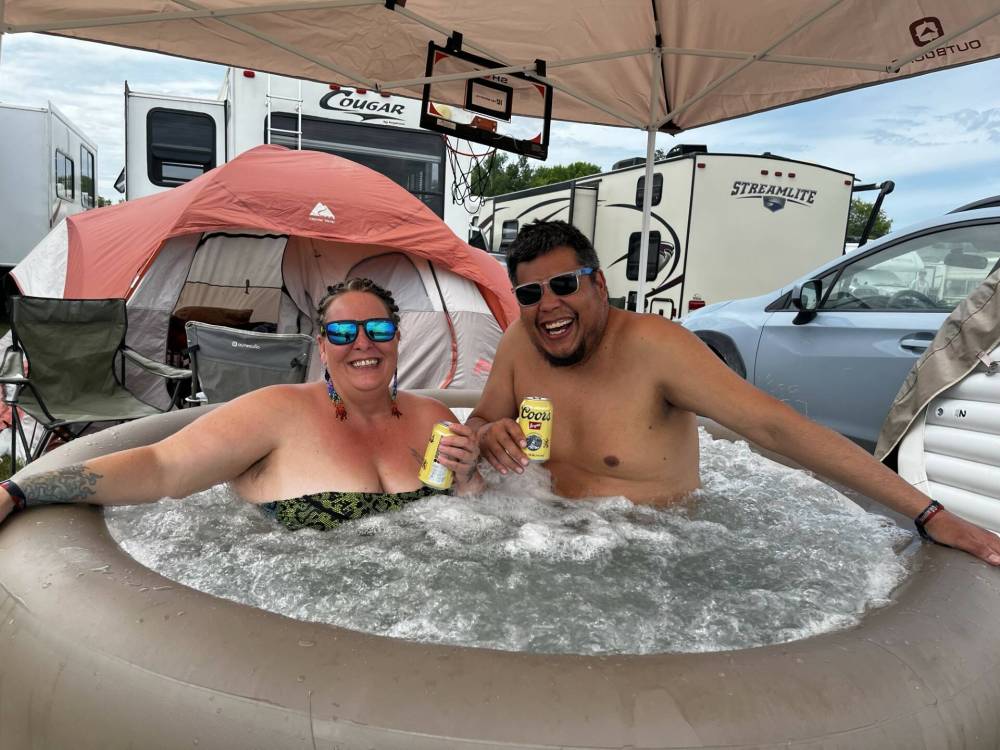Winnipeg’s Rebecca and Dana Wells in an inflatable hot tub at their campsite at this year’s Countryfest. (Michele McDougall/The Brandon Sun)