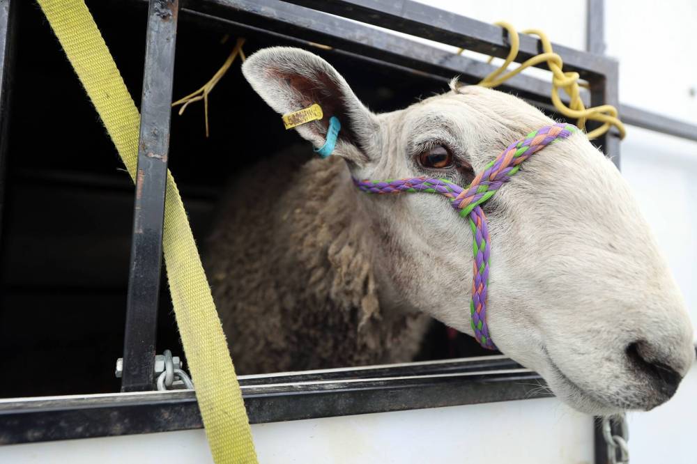 A sheep pokes its head out of a trailer in the parking lot of the Minnedosa Agricultural Grounds. (Connor McDowell/The Brandon Sun files)