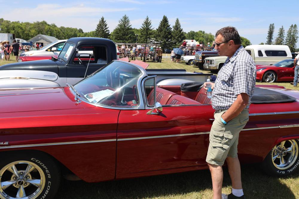 Don Watt admires a 1960 Pontiac Catalina during the Carberry Ag Society fair car show on Saturday afternoon. (Abiola Odutola/The Brandon Sun)