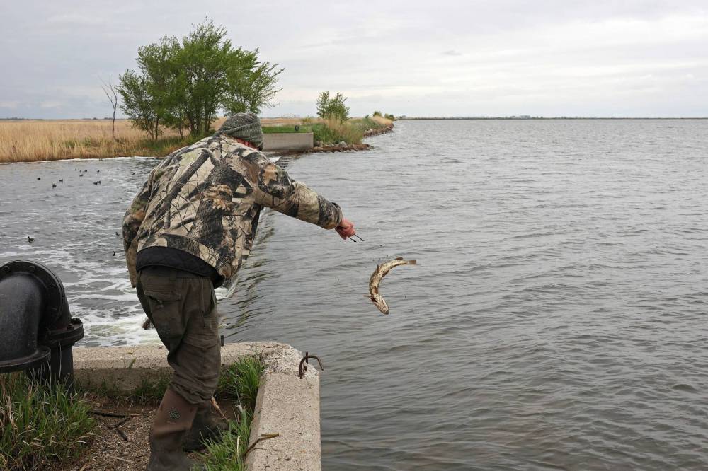 Mike Ketcheson of Brandon releases a northern pike back into Oak Lake while fishing at the lake's outlet dam. (Tim Smith/The Brandon Sun files)