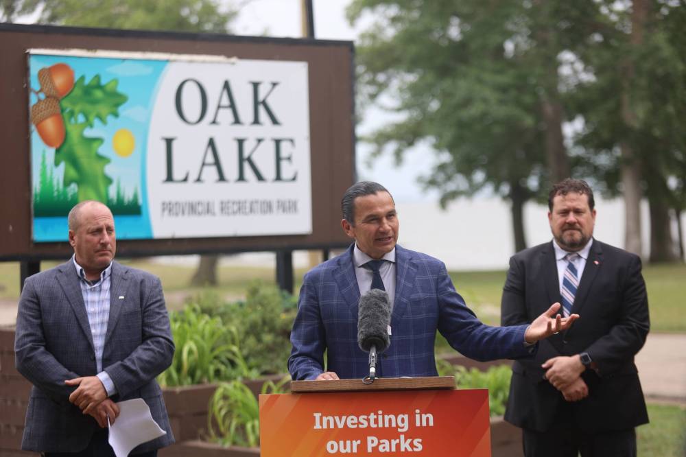 Manitoba Premier Wab Kinew announces a $95,000 grant at Oak Lake Provincial Park on Friday. The funding will help install an aeration system on the lakebed in order to improve water quality. With him for the announcement are Municipal and Northern Relations Minister Glen Simard (right) and Scott Phillips, vice-president of the Association of Manitoba Municipalities. (Connor McDowell/The Brandon Sun)