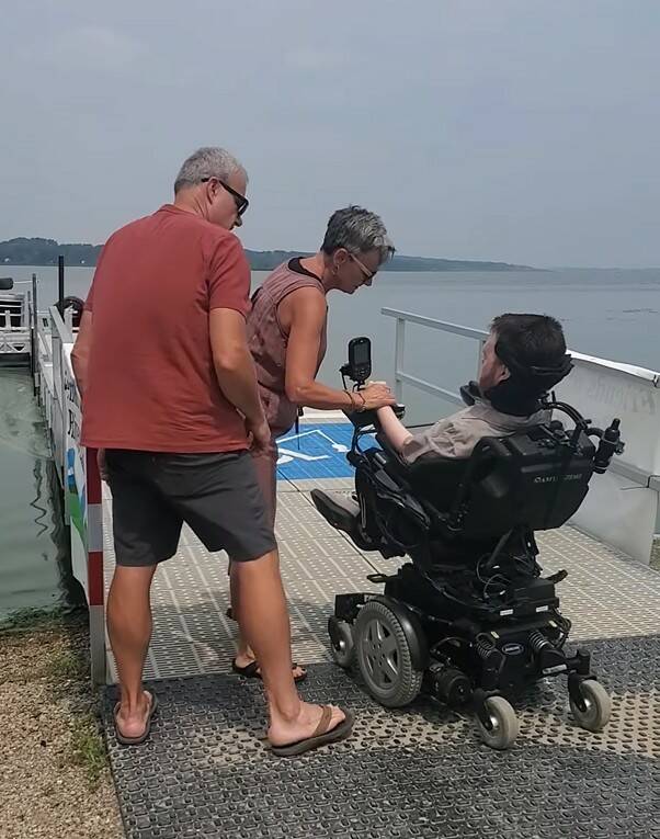 Jeremy Bray (right) prepares to use the accessible dock at Rivers Provincial Park to board a pontoon boat during the dock’s grand opening. The dock features bumper rails and a folding ramp that helps wheelchair users board boats. (Friends of Rivers Lake/Facebook)