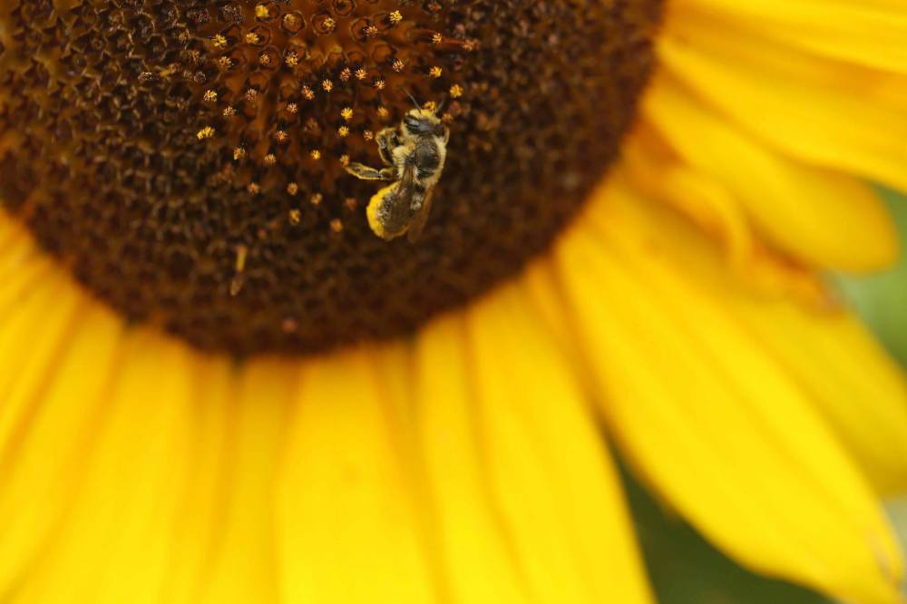 A bee collects pollen from a sunflower at the Hummingbird Community Garden. (Tim Smith/The Brandon Sun)
