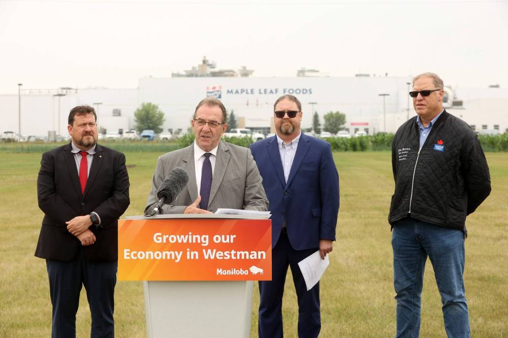 Agriculture Minister Ron Kostyshyn speaks as Municipal and Northern Relations Minister Glen Simard, Canada Packers Inc. director of operations Rob Ackerblade and Maple Leaf Foods plant manager Jim Brown look on during an announcement by the province at Maple Leaf Foods in Brandon on Wednesday. (Tim Smith/The Brandon Sun)