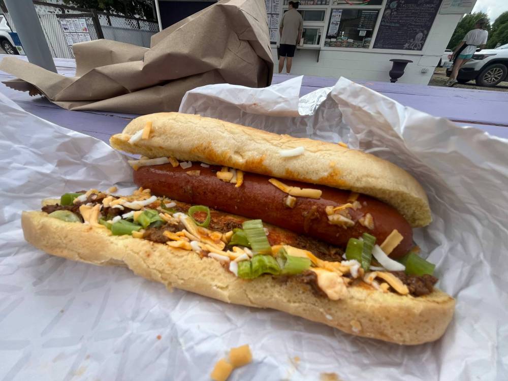 The Mexi Dog, which includes a large wienie topped with cheddar cheese, taco meat, salsa and green onions for $8, is tasty but messy fare. Make sure to keep the dog wrapped in the foil it comes in, or be prepared to have it fall apart on your lap.
