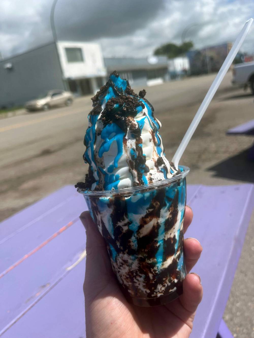 ABOVE: Pope’s Drive In has become a great place for innovative ideas, with staff given the freedom to experiment. That’s how the Cookie Monster Parfait was born vanilla soft serve ice cream topped with blue raspberry cone dip, crushed Oreo cookies and chocolate sauce.