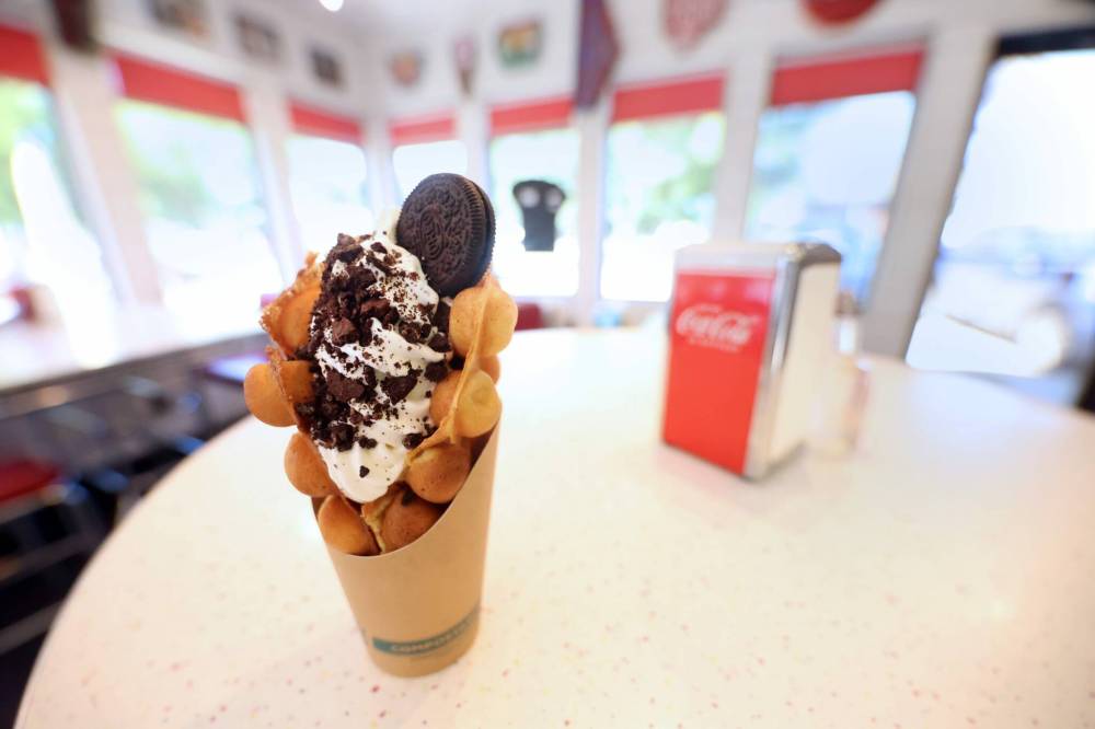 The little eggs are balls of cooked waffle batter that wrap around a large serving of your choice of soft serve ice cream, curled into a cardboard container, and topped with smarties or Oreo cookie crumbs, among other choices.