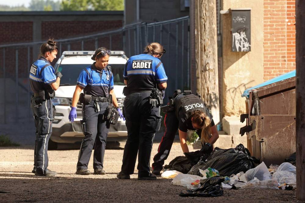 Brandon Community Cadets and a Brandon Police Service member look through garbage outside a dumpster in an alley north of Rosser Avenue between Ninth Street and 10th Street in Brandon on Wednesday morning. BPS members responded to a gun allegedly being fired in the apartment building. (Tim Smith/The Brandon Sun)