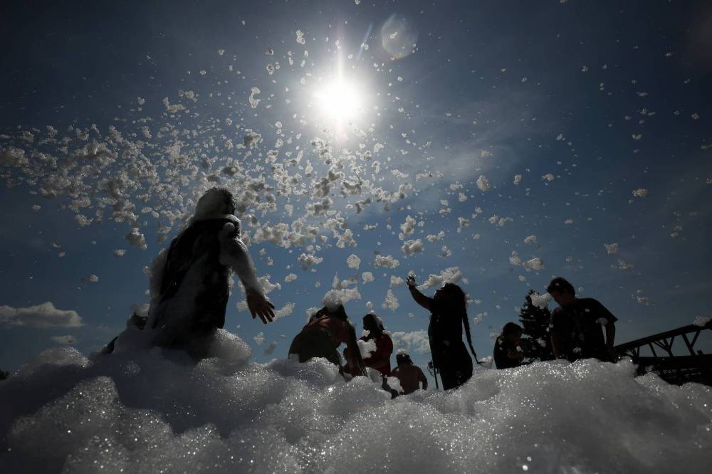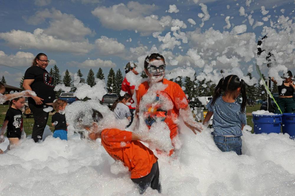 Kids play in foam during a family wellness day full of games, activities, food and entertainment at Sioux Valley Dakota Nation on a hot Friday. Sioux Valley invited evacuees displaced by wildfires to take part in the day at the First Nation west of Brandon. (Photos by Tim Smith/The Brandon Sun)
