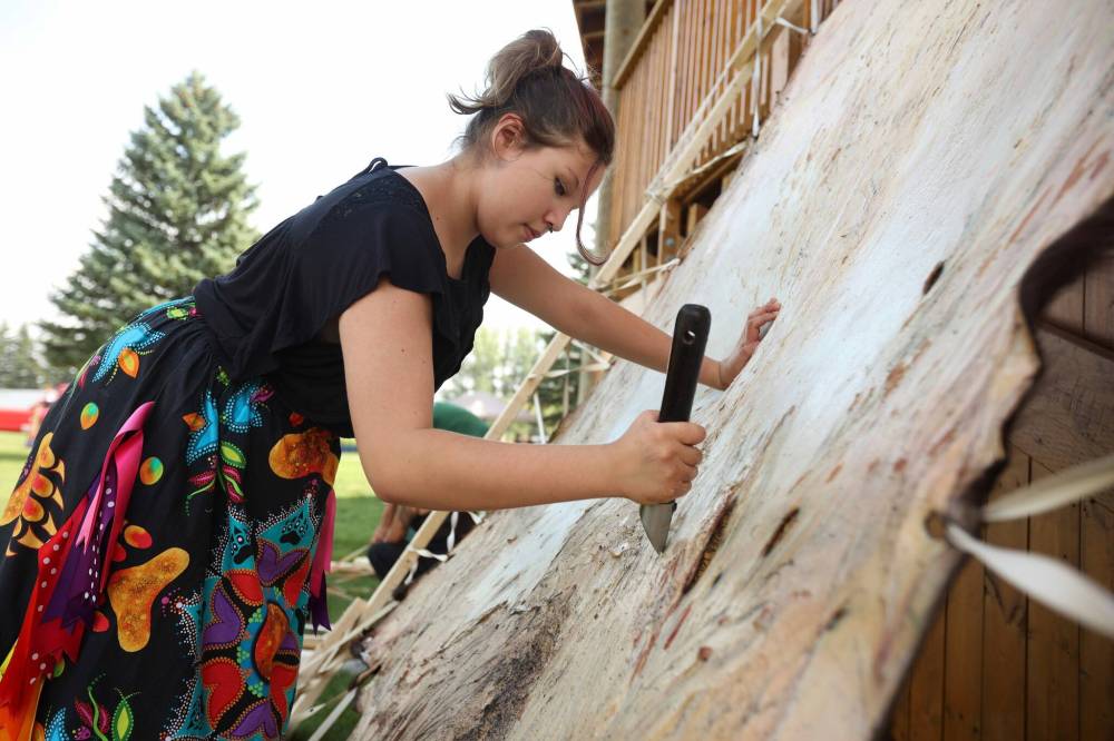 Lynnianna Swan scrapes a buffalo hide during Friday’s event. The hide was donated by the The Buffalo Culture Collective to be used by Sioux Valley members. Sioux Valley also harvested one of their own bisons for use of the meat and hide as part of the wellness day.