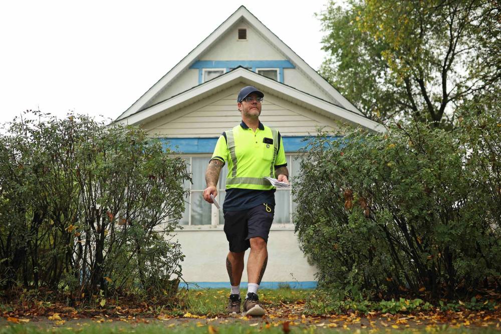 Canada Post letter carrier Tyler Stephens delivers mail in Brandon on Monday morning. The Canadian Union of Postal Workers stopped delivering and processing business flyers as of Monday amid its ongoing labour dispute with Canada Post. (Tim Smith/The Brandon Sun)