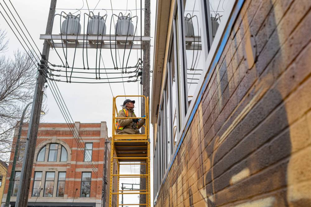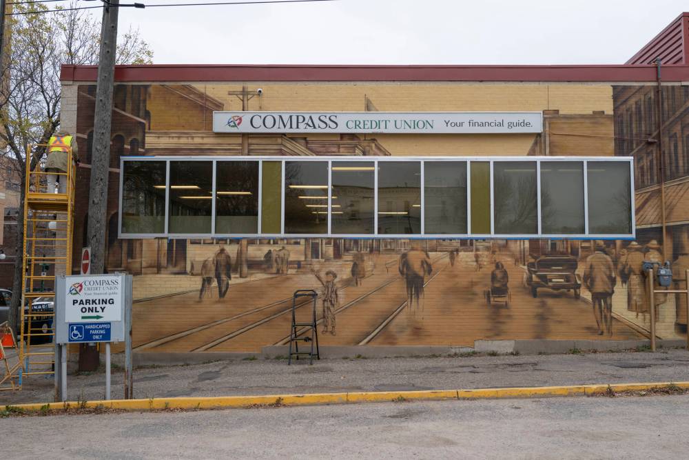 Winnipeg-based artist Nereo Zorro works on a mural on the exterior wall of the Compass Credit Union along Rosser Avenue on Wednesday. (Photos by Weichen Zhang/The Brandon Sun )