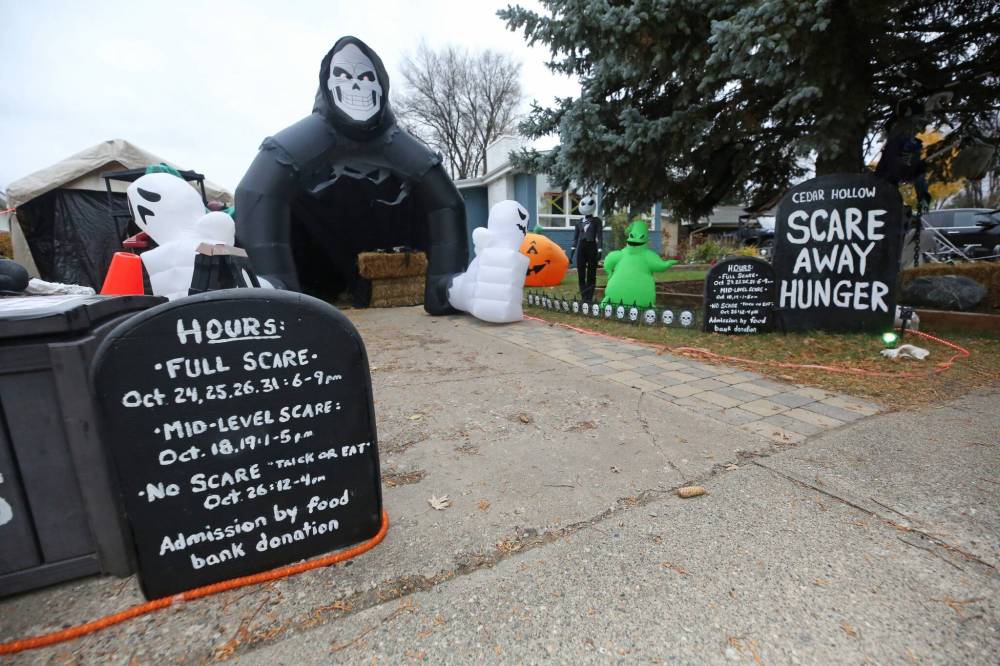 The view from the sidewalk outside the annual Scare Away Hunger Halloween-themed yard on Cedar Bay, owned by Carla and Mike Mitchell. The residence turned haunted venue will open to the public Friday evening, and also be available for spooky thrill seekers on Saturday, Sunday and Oct. 31. Bring a food bank item to the Mitchells’ Scare Away Hunger venue for admission. The Scare Away Hunger haunted house is just one of the Halloween-themed attractions in Westman this month. (Matt Goerzen/The Brandon Sun)