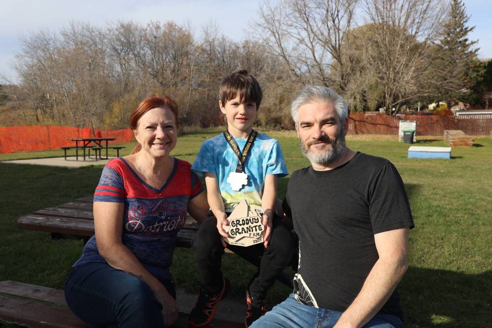 Eight-year-old Samuel Chiupka (centre) with his father, Jonathan (right), and grandma, Linda, on Saturday. Samuel made headlines after outrunning dozens of adults to win the 2025 Groovy Granite seven-kilometre race in Lac du Bonnet recently. (Abiola Odutola/The Brandon Sun)