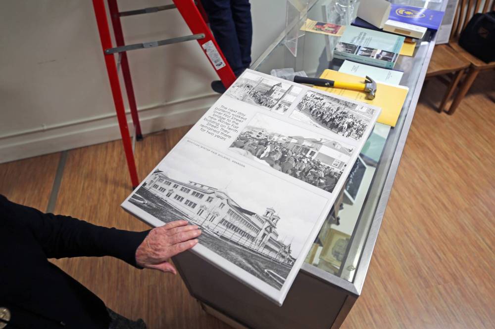 LEFT: Patients of the former Brandon Asylum for the Insane are seen walking in 1910 on their way to a former fair building that would become their new home. The patients were displaced when a fire destroyed the facility the previous day. The scene is part of a display at the Brandon General Museum and Archives in downtown. RIGHT: Keith Waterfield, administrator of the Brandon General Museum and Archives, hangs the third storyboard for a fire exhibit in October. (Connor McDowell/The Brandon Sun)