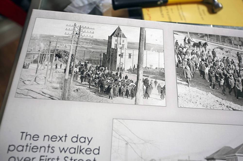 As the museum’s new storyboards show, back in 1910, following the fire at the mental hospital, patients walked in a crowd down from the north hill. They crossed the Assiniboine River over a bridge on First Street, and walked to their new home, a former fair building located where the Brandon Police Service station sits today.