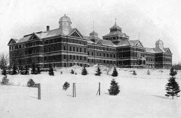 The then Brandon Asylum for the Insane building constructed in 1912. It replaced a former building that was destroyed by a fire two years earlier. Features of the building are still visible on the north hill in Brandon and forms part of the Assiniboine College campus. (Source: Manitoba Historical Society)