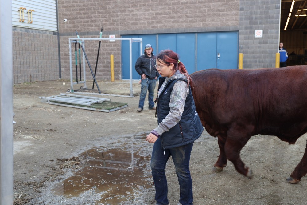 A breeder takes her cattle out of the Assiniboine Credit Union Agricultural Centre into a trailer as the Manitoba Ag Ex wrapped up on Saturday evening. (Abiola Odutola/The Brandon Sun)