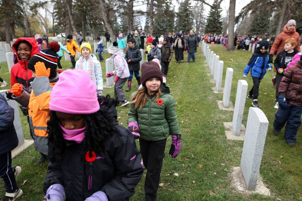 About 750 students from four Brandon schools placed poppies next to headstones on Thursday as they paid their respects to soldiers who died while serving in war.